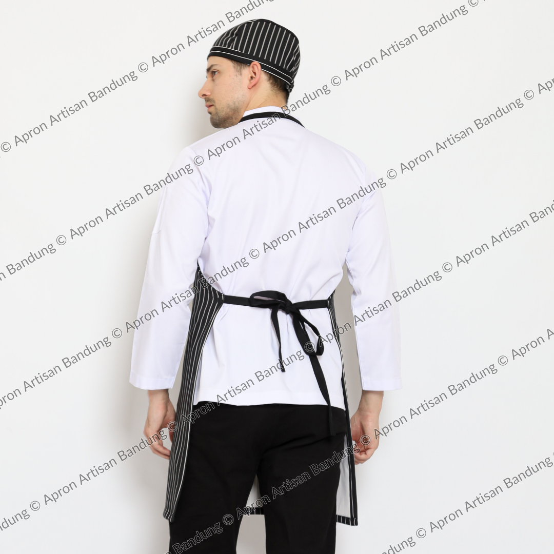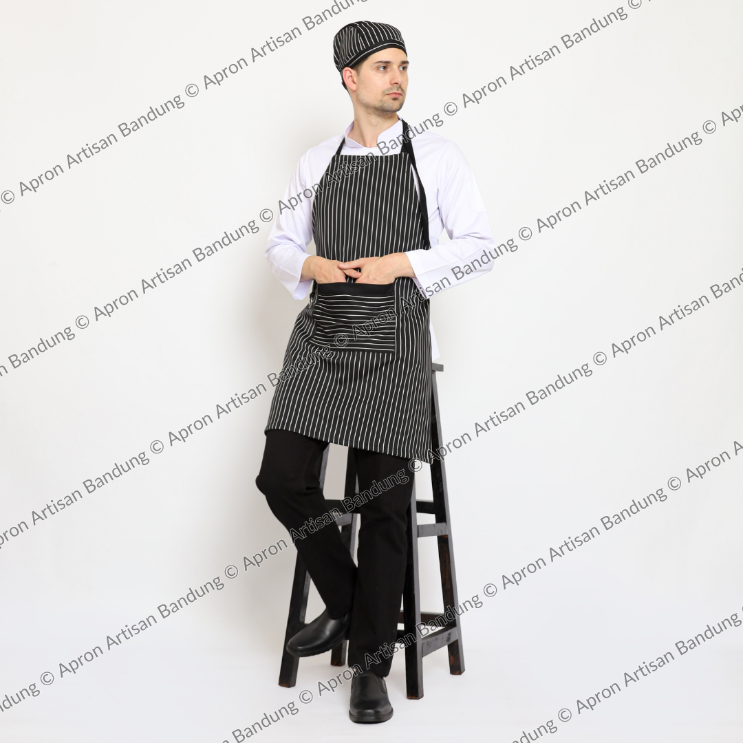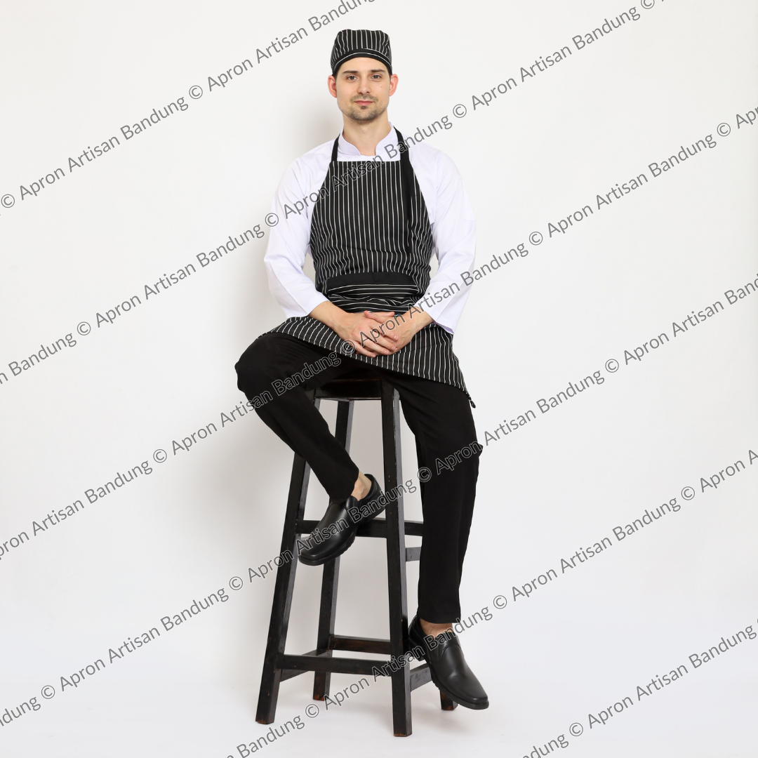 Apron tersedia dalam warna hitam dengan detail list putih, memberikan tampilan yang elegan dan serasi dengan berbagai macam pakaian. Apron ini juga merupakan produk handmade asli dari Bandung, sehingga menjadikannya sebagai produk yang unik dan memiliki ciri khas khas dari Bandung.